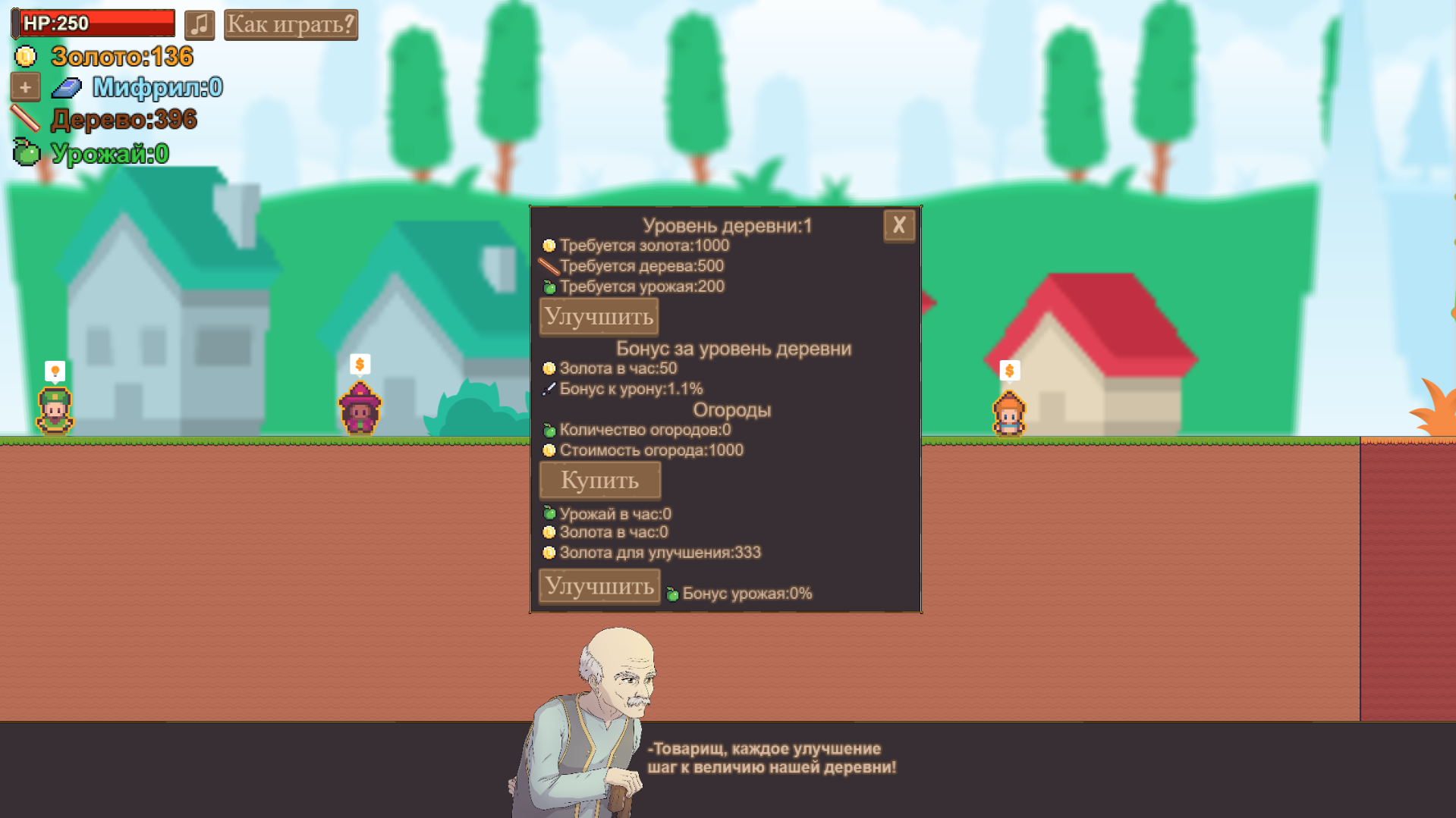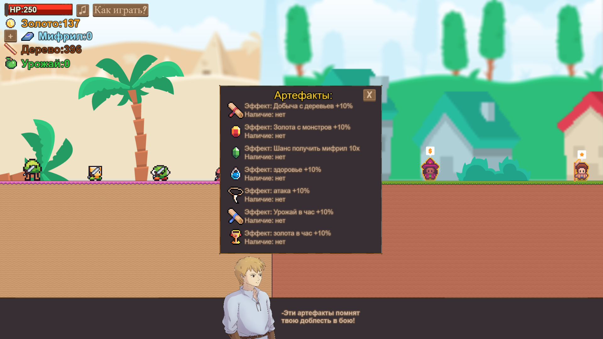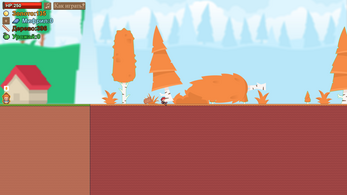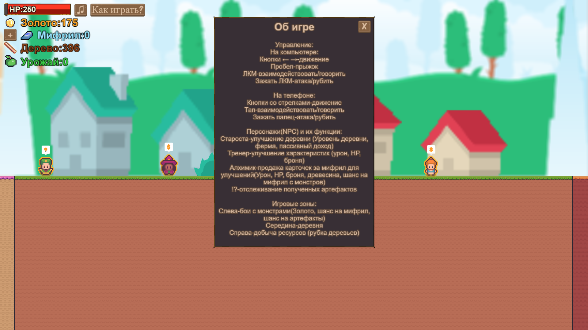 A simple game where you extract resources from monsters and trees, improve your character, village, the game has a help menu at the very top of the screen, there is information with controls (Keyboard, mouse), and information about the game itself.